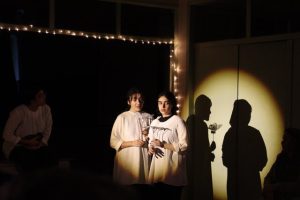 هر یک از این هنرجویان راهنمای دو تن از تماشاگران است چراکه نمایش صرفا در فضای سالن اجرا نمیشود. اجرای این کار از راهروهای هنرستان شروع میشود.