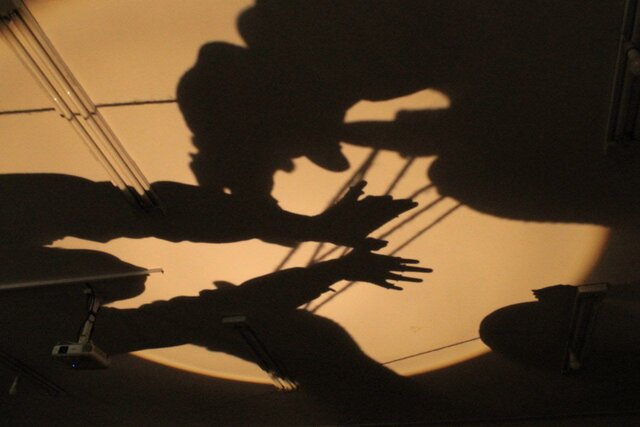 با راهنمایی راهنمای خود وارد فضای راهرو میشویم. هنرجویان سینما با چراغ قوههایی که در دست دارند، بر نقاشیهایی نور میاندازند که با قلم هنرجویان نقاشی کشیده شدهاند. نقاشیهایی که همه شاپرک هستند. پوستر نمایش هم کار دست هنرجویان گرافیک است. ابتدا و انتهای کار هم دو قطعه انیمیشن میبینیم که ساخته هنرجویان سینماست.