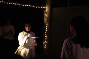 اغلب مهمانان پدران و مادران هنرجویان هستند و به ساعت اجرا که نزدیک میشویم، الکا هدایت، سرگروه رشته تئاتر هنرستان هنرهای زیبای دختران تهران، به ما خوشامد میگوید و توضیح میدهد که این نمایش با بازی هنرجویان سال یازدهم برای اجرا آماده شده است.