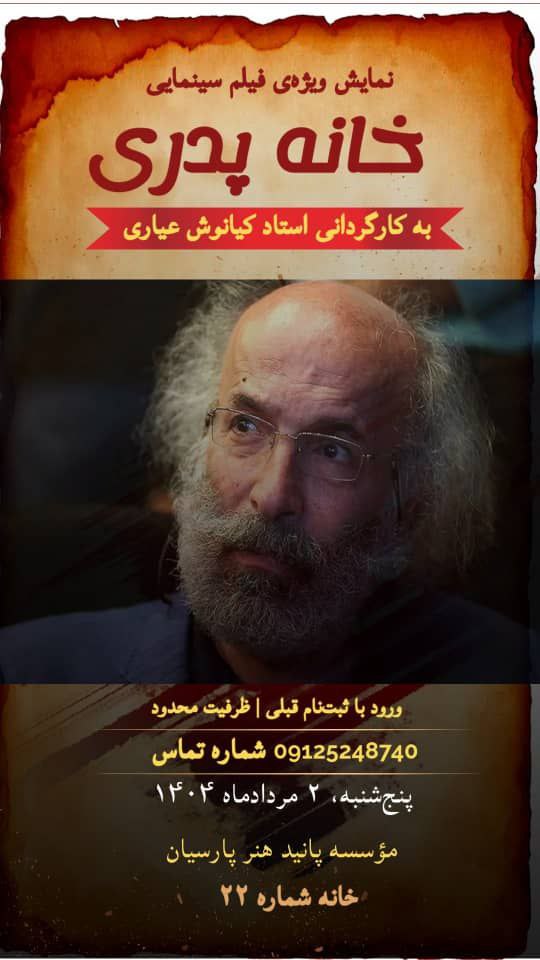 فیلم سینمایی «خانه پدری» ساخته کیانوش عیاری در خانه شماره ۲۲ نمایش داده می شود.